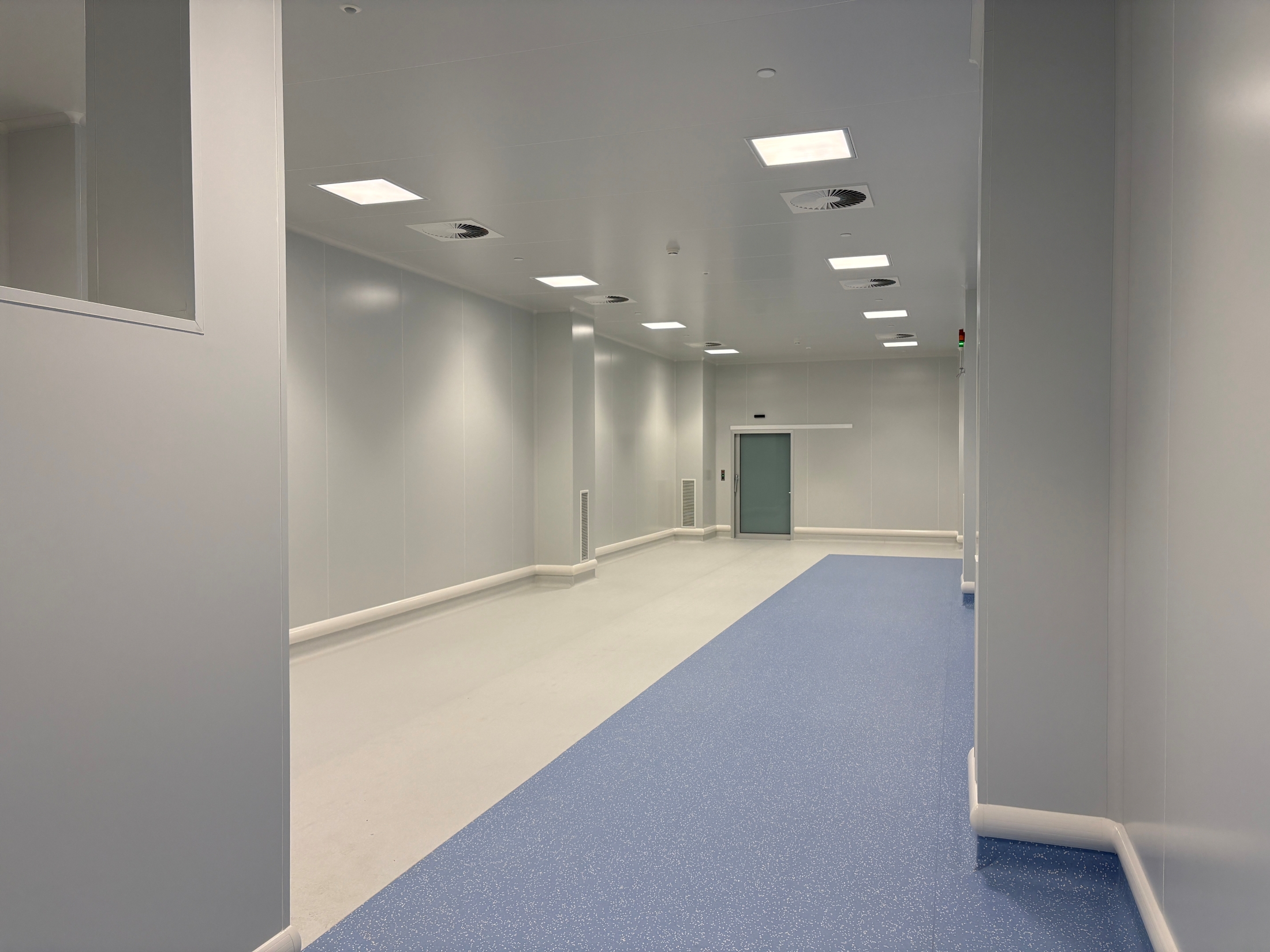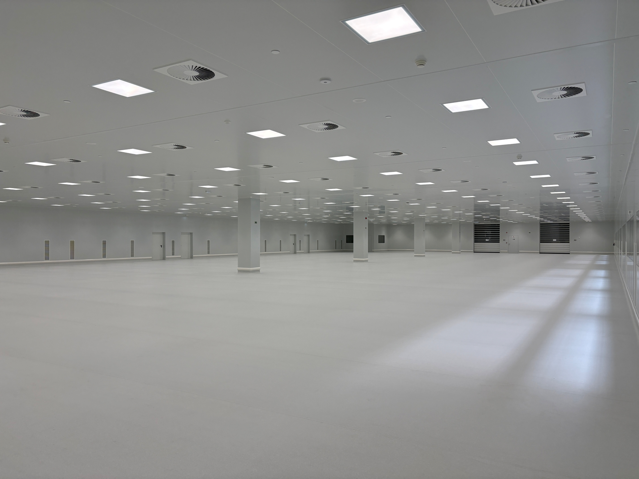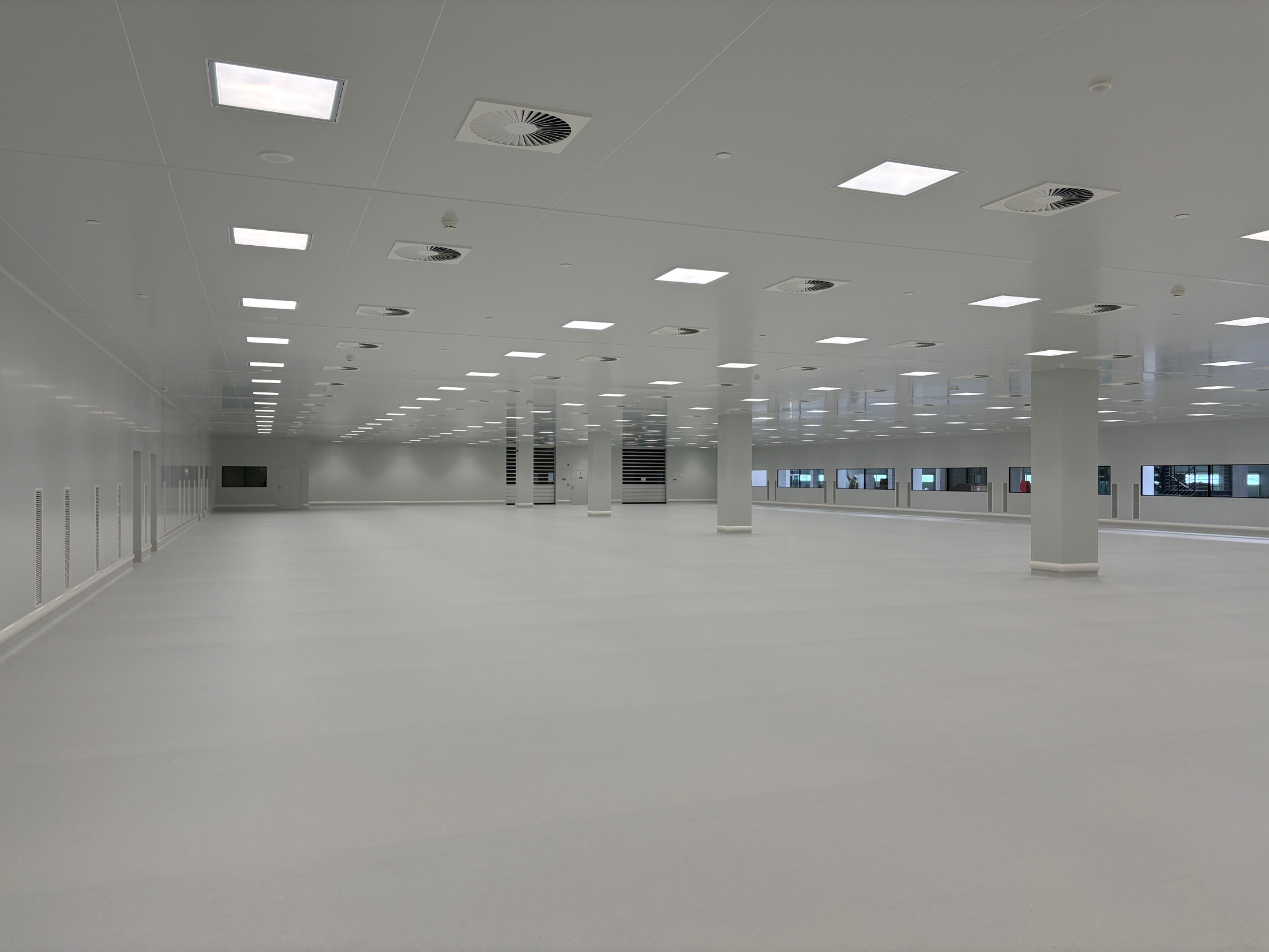 The facility includes approx. 11,500 m² of clean room production areas, designed with large ballroom-style layouts, with the largest individual clean room spanning approx. 1,900 m². The building layout allows for a future expansion of the clean room production area by an additional approx. 7,000 m². Clean rooms are designed to meet ISO 7 classification in the at-rest state, while maintaining ISO 8 conditions during operation.